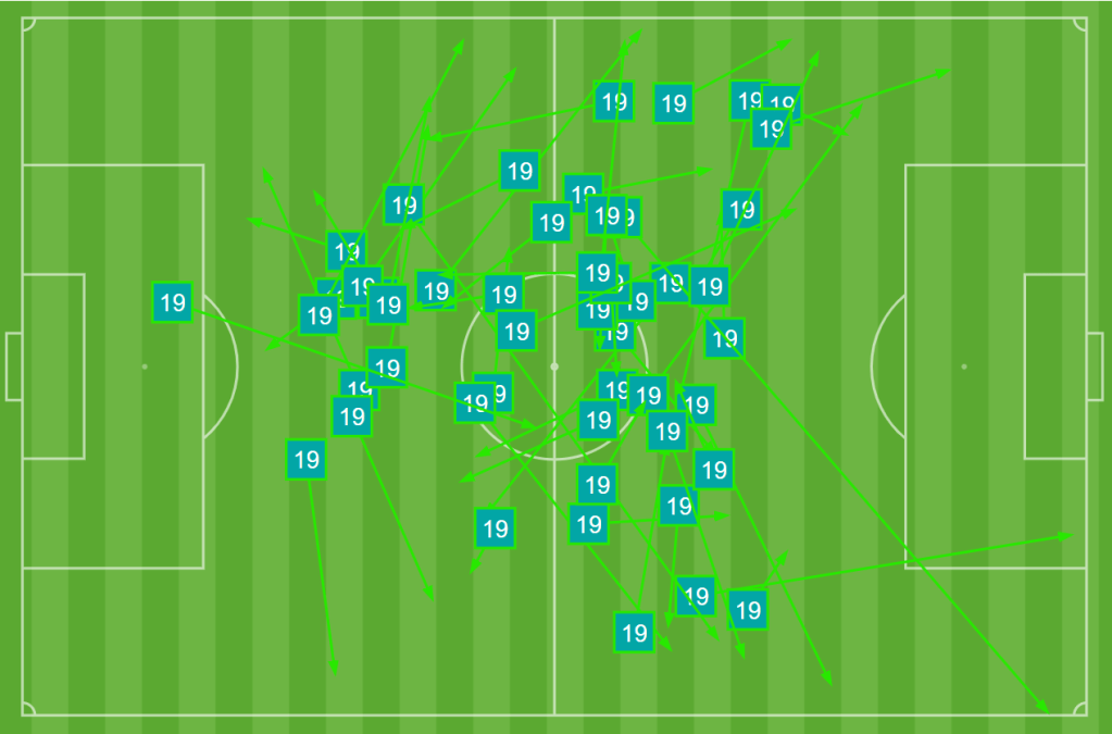 From this position, he sprayed diagonal long passes left to right with a high degree of precision. Noah Verhoeven’s passing map shows a man who influenced the match in all phases of possession, from his six long passes to five key passes.