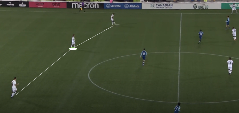 Despite the change of personnel, the over-arching ideologies behind the tactic stayed the same. Kyle Bekker held a more reserved role down the left-hand-side of the midfield, using his expert passing range to spray long passes forward. With Bekker and Achinioti-Jönsson holding, the Hammers built out from the back in a 3+2 shape, with a solid mix of patient possession and progressiveness into the wide channels. Alessandro Hojabrpour found himself in more of a free role down the right as a result, playing almost as a ‘number 10’ in attack and getting on the end of many of Forge’s best chances – in fact their two ‘big chances’ in the match. Despite our raving review on Pacific’s press, it also must be said that Samuel and Metusala held their own in circulation stages, confidently passing the ball around and in Metusala’s case – taking moments to carry the ball forward and break lines on his own (I love when he does this). Terran Campbell also played a role in inverting into left-half-spaces to facilitate the high position of the left-back, but never got up to full speed.
