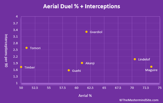 Given the aerial dominance that Maguire and Lindelof both pose, finding an adequate aerial replacement becomes a difficult task. When considering the normal attributes of a sweeper – typically a smaller, neat and tidy footballer like Jurriën Timber, it’s unsurprising that few of our candidates live up to that billing. At the very least, if the player that comes in understands their specific role, has good positional sense, and can make interceptions, they could theoretically make up for a lack of physical strength in the air through positioning and awareness. This is why we’ve lumped these two unrelated statistics together, and Josko Gvardiol is the man that comes out on top by quite some margin. Manuel Akanji’s numbers are once again promising, even if not to the same physical capacity of Maguire and Lindelof.