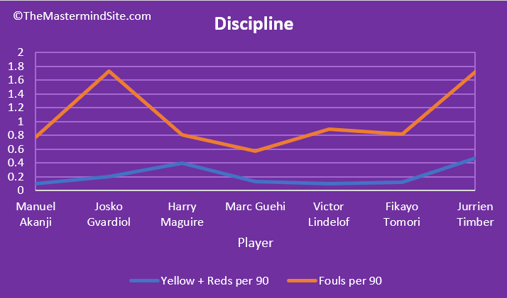 In our final examination, we study the discipline of our candidates, attempting to assess how level-headed they could be in a high-line, even at times despite being a proactive defender. All four of Marc Guehi, Victor Lindelof, Fikayo Tomori and Manuel Akanji boast excellent disciplinary records. Gvardiol, as a bulldozer, ranks similarly rash to Maguire, with Timber’s small sample size and the magnitude of those Champions League matches potentially playing into his poor disciplinary record in the data examined.