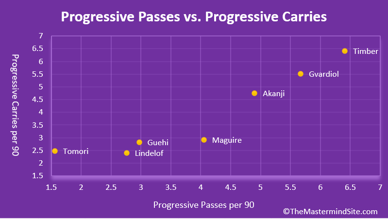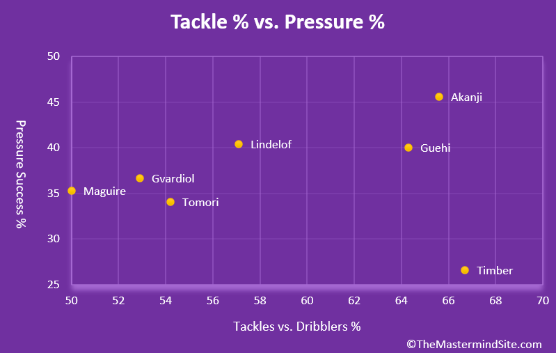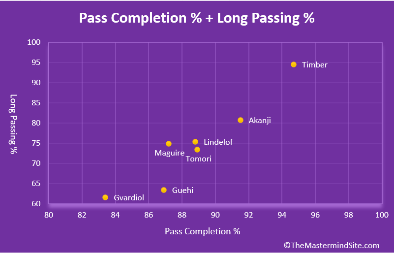 Another strength of Maguire and Lindelof that must be maintained is their utter class in possession. 20-year-old Timber again smashes the rest of the pack for his play in the UEFA Champions League this season, completing over 90% of his long passes. Manuel Akanji finishes as an unsurprising runner-up in both categories, and Victor Lindelof slightly outshines Harry Maguire – likely as a function of the captain’s slightly higher progressive numbers. Josko Gvardiol finishes last in both categories this time, with a weak long passing percentage. However, given that Maguire and Lindelof rank highly, neither Gvardiol or Guehi can be discounted, as the goal is to find equilibrium.