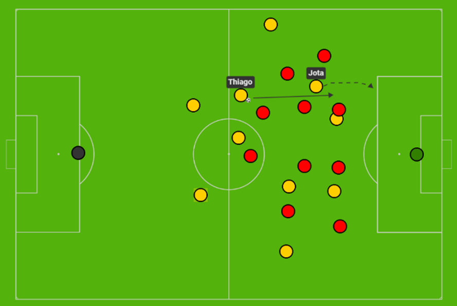 He may not contribute many assists, but you will often see Thiago be the man to play the pass that opens up the game for the assist. Take this example of his exceptional range against Man City at the Etihad. Not many players would even envisage an opening to play this diagonal pass. But Thiago found the gap and split Manchester City’s team wide open. This long ball created the opportunity for Jota to equalize after an authoritative start from the Citizens.