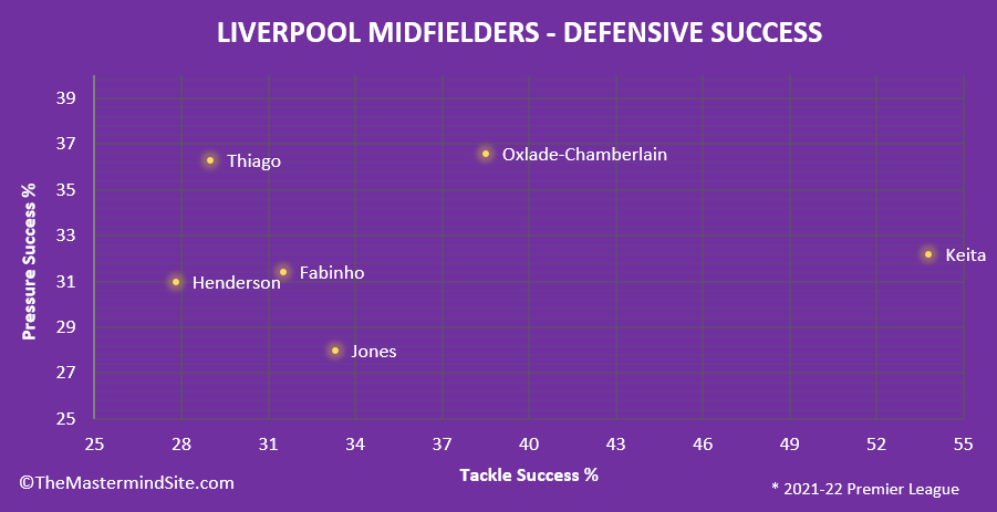 Strong in the tackle, Thiago uses his tactical intelligence to position himself advantageously to aid Liverpool’s gegenpress. As part of Klopp’s zonal marking approach, Thiago has a clear understanding of his role in Liverpool’s midfield three, and only Keita stands out more when it comes to ‘defensive success’. With the Reds winning 16 of his 18 starts, his influence to Klopp’s midfield cannot be understated.