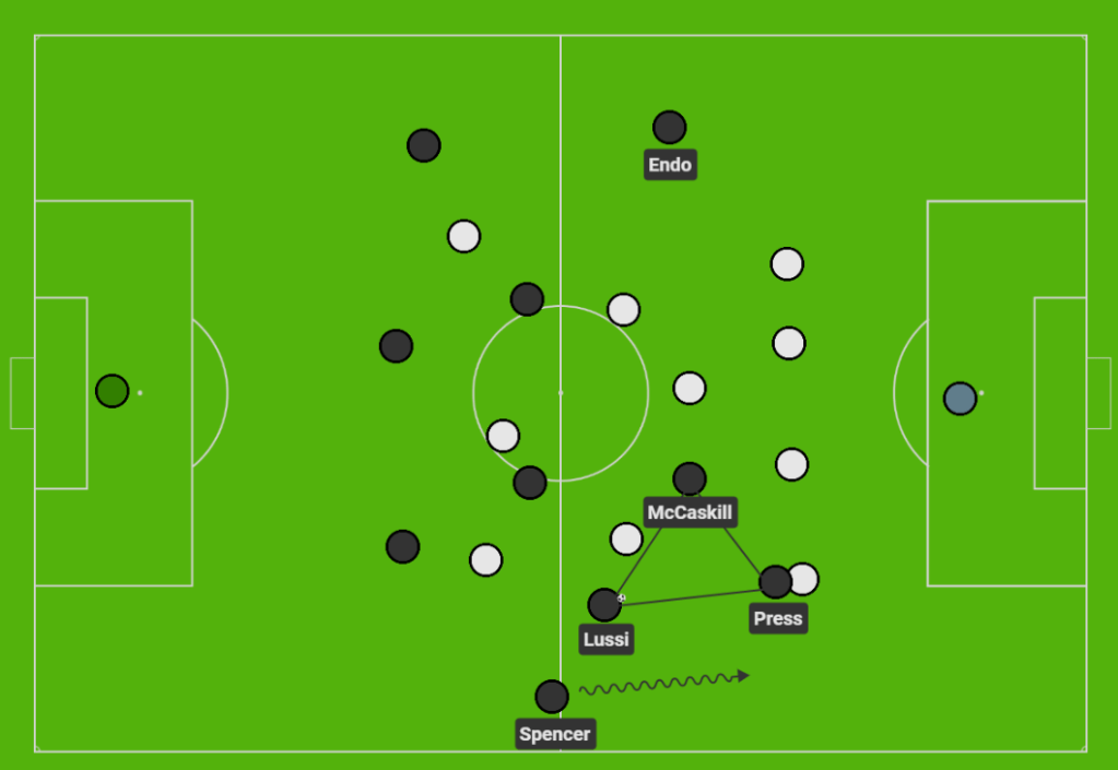 With the energetic dribbling and running power of Endo, the other members of the front four all worked to combine down the right through wide overloads, with Jasmyne Spencer only compounding matters through her overlapping runs down the right. They combined excellently in tight spaces against a sturdy North Carolina defense, often before switching play to the other side where Endo held the width. The narrow 4-3-1-2 pressing shape Nahas deployed worked against them in this way, with North Carolina’s midfielders having too much ground to cover out wide against all the wide overloads.