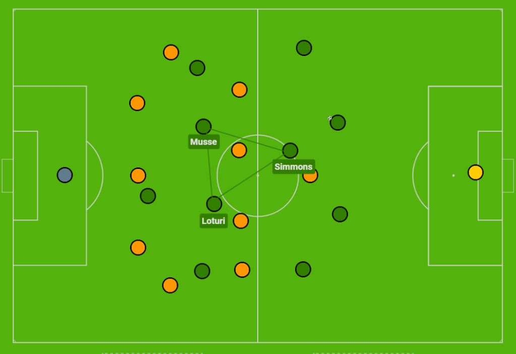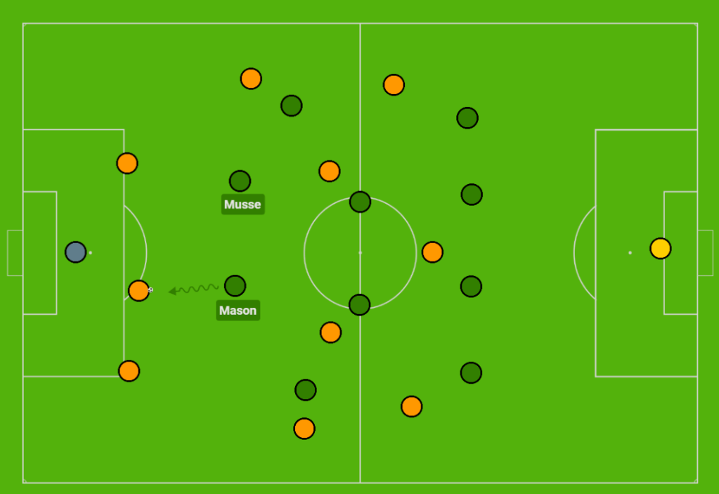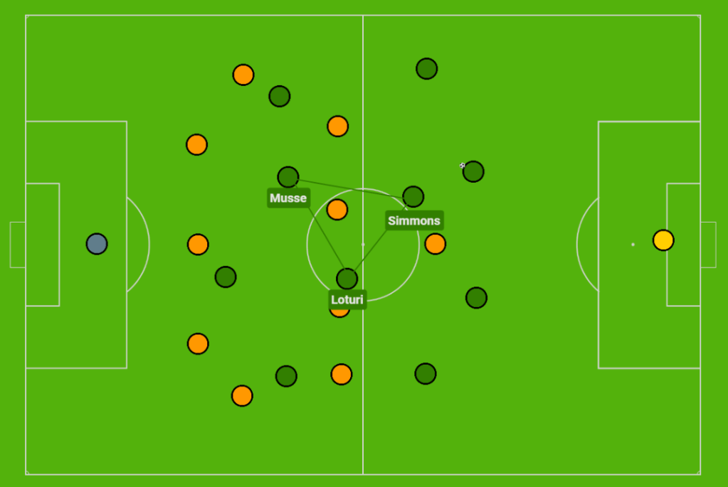 Musse would then burst forward back into a 4-4-2 immediately following the ball making its way into Cale Loughrey instead, as the others in behind pushed up with the play.