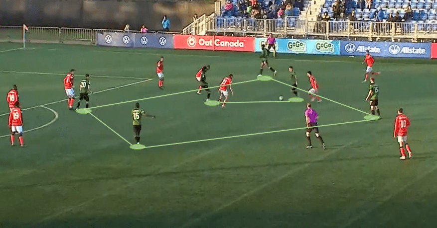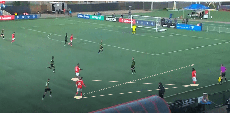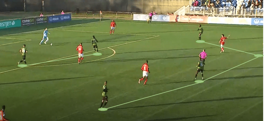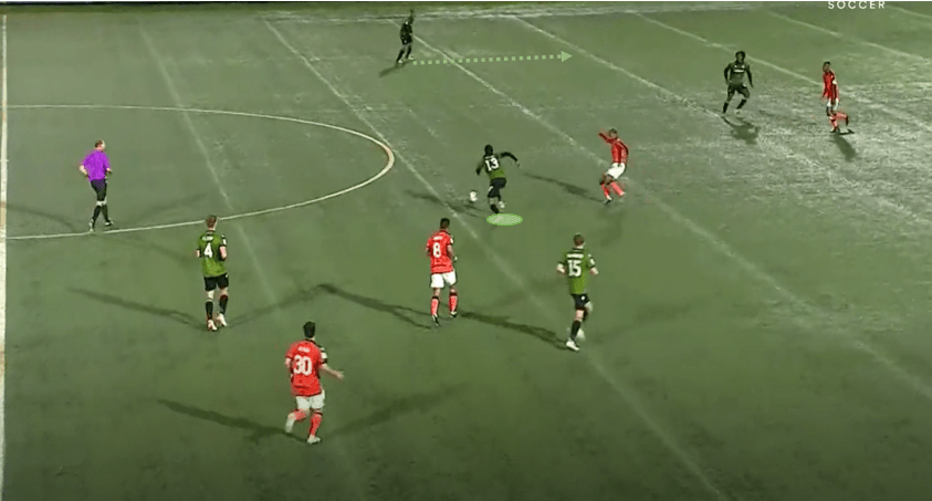 This occurred particularly in moments of transition, where Aird or Vliet tucked too far inside. With better switches of play and less verticality in transition (counter-intuitive, I know), Edmonton easily could have taken advantage of these wide spaces. In other instances, in fact in Edmonton’s most positive patterns of play, they utilized T-Boy Fayia to overlap Tobias Warschewski, and positional rotation to open further corridors of space. As the German drifted toward the ball to receive, Bradley Vliet often came with him. Escalante then had to track the movement of Fayia as he floated higher up the pitch, where the Honduran often had no choice but to let the full-back receive.