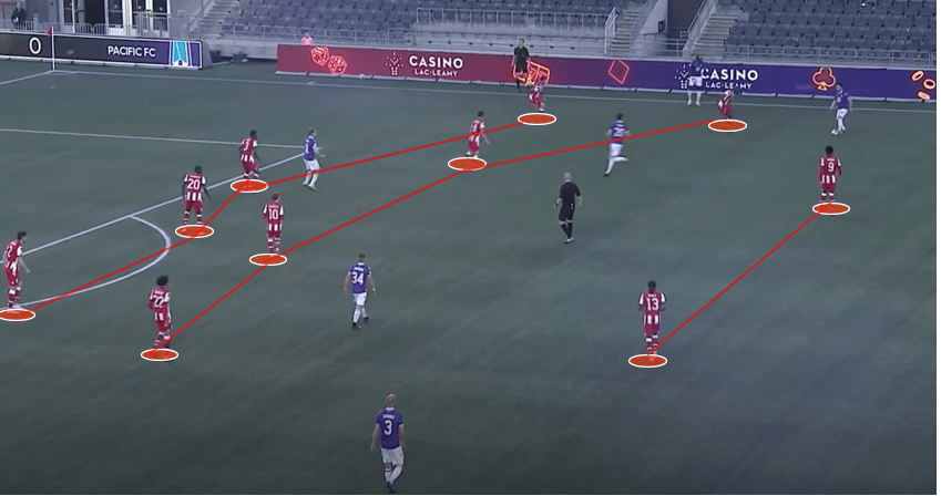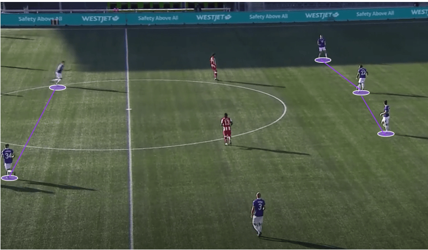 Cavalry’s command against Edmonton started right from their defensive line, which played a crucial role building out from the back. The fullbacks held relatively low positions, and so too did Elliot Simmons, as Victor Loturi and Ali Musse sought space further ahead. As part of their midfield balance, each of Cavalry’s midfielders held a different degree of height in build up to progression phases, creating the terrific triangle pictured above. This allowed ease of access for opening corridors in between the lines, and disrupted Edmonton’s own desire to hold their own. Cavalry recognized the gaps in between Edmonton’s line of five and midfield unit of four, and used the shifting heights of their central midfielders to wonderfully exploit that space.