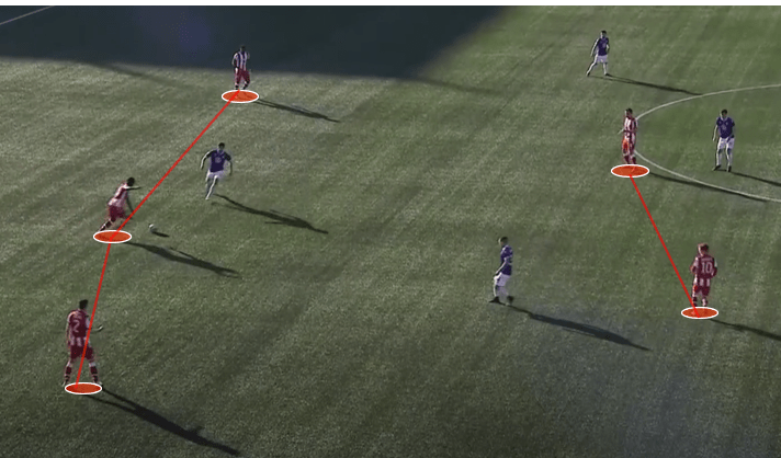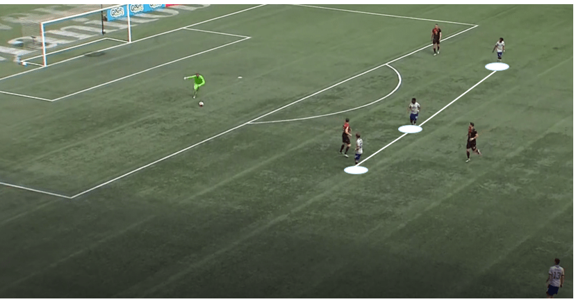 Similarly to York’s goal against Forge, the narrow shape in this moment allowed the Cavs to quickly play one-touch passes against a flat-footed defense, with the ball travelling shorter distances before the next action – causing the need for quicker reaction times.