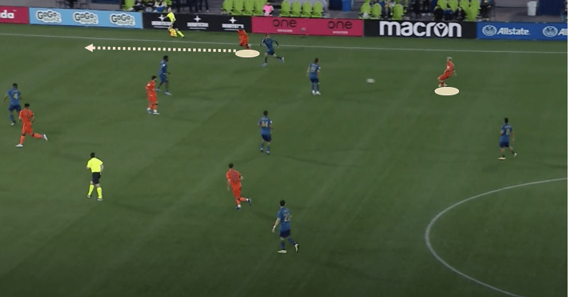 This occurred particularly in moments of transition, where Aird or Vliet tucked too far inside. With better switches of play and less verticality in transition (counter-intuitive, I know), Edmonton easily could have taken advantage of these wide spaces. In other instances, in fact in Edmonton’s most positive patterns of play, they utilized T-Boy Fayia to overlap Tobias Warschewski, and positional rotation to open further corridors of space. As the German drifted toward the ball to receive, Bradley Vliet often came with him. Escalante then had to track the movement of Fayia as he floated higher up the pitch, where the Honduran often had no choice but to let the full-back receive.