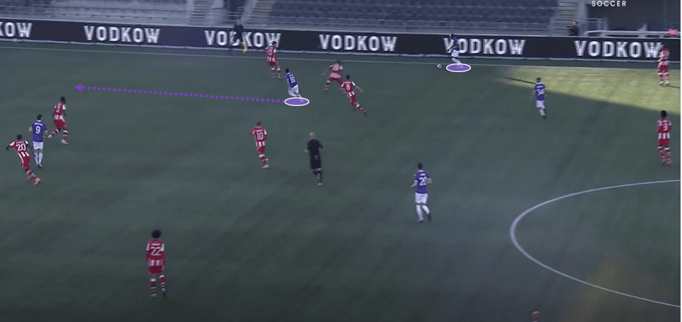 These kind of rotations pushed Tristan Borges into central channels closer to goal to try and thread the needle through toward Terran Campbell. On that opening occasion, the two players combined tremendously well to get beyond York’s defense. But for the remaining 89 minutes, Borges had a relatively quiet evening.