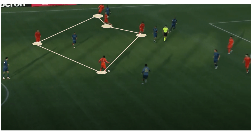 With 58% of the possession (69% in the first half), Wheeldon Jr.’s team never lost their dominance in the match. They even switched to a 3-4-1-2 midway through the second half, allowing Musse even greater ease of access for receiving passes in between the lines. The Canadian midfielder brilliantly found himself in acres of space time and time again in behind Edmonton’s double pivot as they threw numbers forward, and could continuously use his pace and timing of the pass to exploit Edmonton’s wide areas as strikers and wing-backs shifted wide to work in harmony.