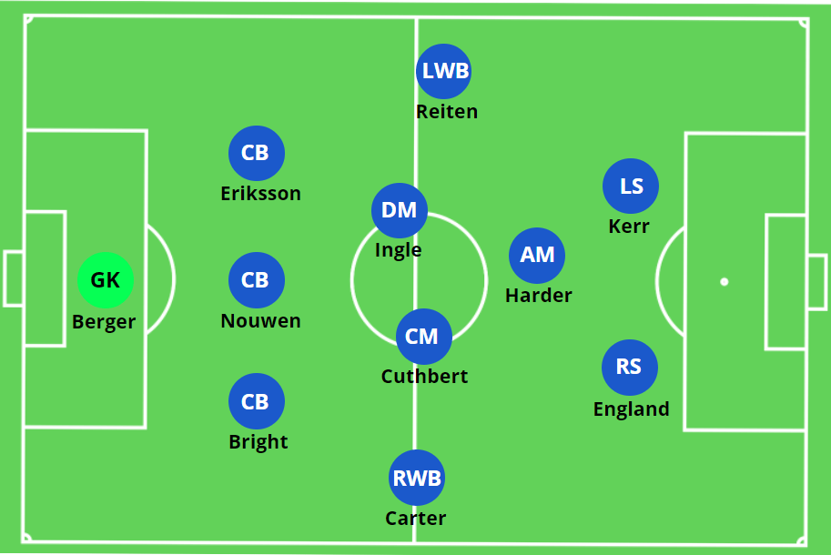 Out of possession, Gareth Taylor’s team set up in a 4-1-4-1 high to mid-block, with Alex Greenwood sweeping in behind Alanna Kennedy. Unfortunately, this caused great concern as they threw numbers forward in extra time, abandoning their normal rest defense structure. The likes of Walsh and Kennedy found themselves far too tired to catch Kerr’s electric pace on the break, and Greenwood didn’t make up her mind quick enough in closing Kerr down and angling the potential pass away from Jessie Fleming.