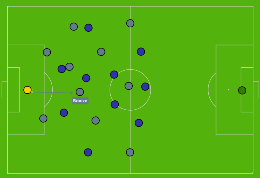 In possession, the Blues operated with a lopsidedness down the left that failed to truly break through City’s system. Three goals aside, they only had a few sound moments of disruption to City’s back-line, even despite their attempts to overload the left. With Sophie Ingle sitting in and acting both as an ‘Anchor’ and ‘Deep-Lying-Playmaker’, Cuthbert could have ventured forward more into right half-spaces to link up with the front line, and Jessica Carter could have potentially taken more moments to gallop up the right and allow Ingle to switch play to the other side. Instead, much of Ingle’s passes were diagonal ones back to the left, where Pernille Harder and the two strikers shifted to the side of the ball.