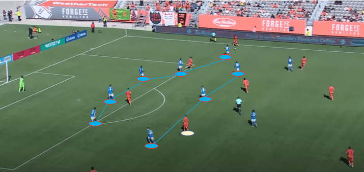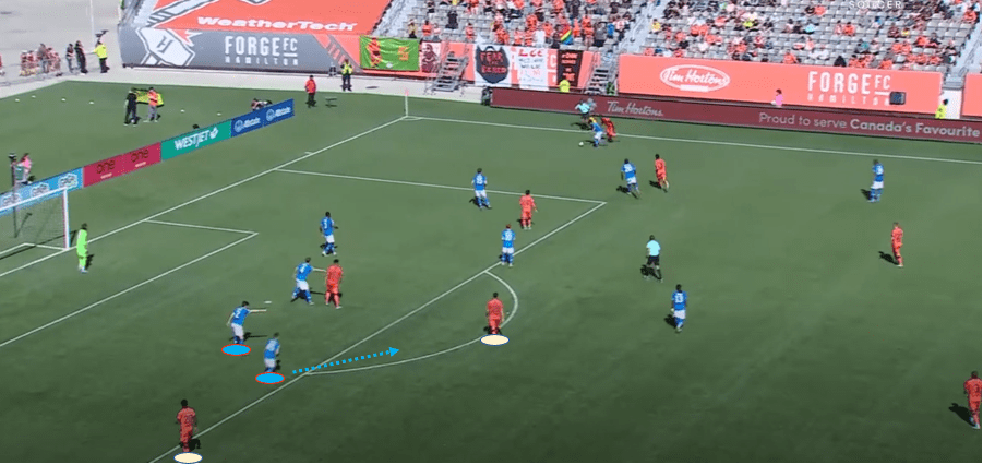They did so through shifting in and out of a 5-3-2 defensive shape, where Zach Verhoven would join the defensive line in tracking wide men into advanced areas. This is undeniably a very natural progression for a defensive team to make against an extraordinarily sound possession-based team. But the other interesting tactical relish to this ideology was in Carl Haworth’s inverted position on the other side. In possession, Atletico’s right-wing-back typically holds the width, as Drew Beckie tucks in to form a back-three. Out of possession, that wing-back becomes more of an orthodox winger, defending in front of Beckie. But as Forge progressed down the right and used Choiniere, Sissoko and Borges to triangulate moves against Ottleti, Haworth inverted on Hojabrpour in central areas, rather than tracking Kwasi Poku – Forge’s left-wing-back.