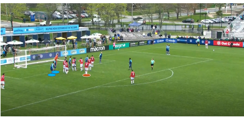 The starting position of Simmons is also odd, given that no player would have been likely to either receive or move into the zone he covered. He could have shifted himself a few steps closer to goal or closer to the penalty spot, which is usually the most congested area for opposition teams to attack. As HFX persisted in playing to the back-post, Cavalry could have been quicker to change their defensive organization.