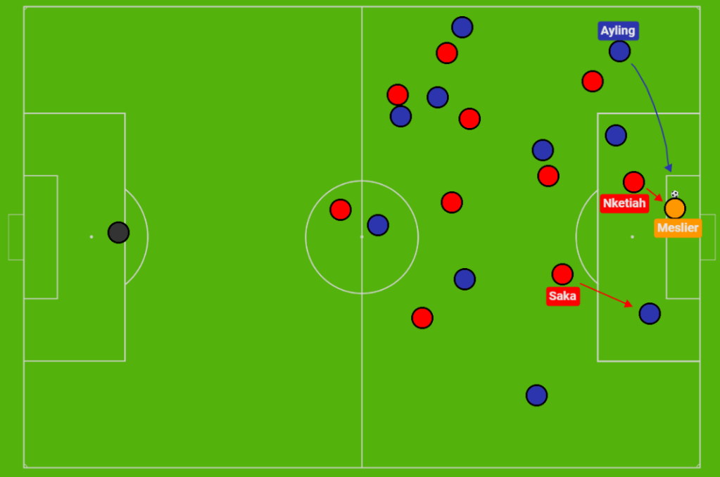 Above, you can see Nketiah’s relentless desire that gave the Gunners an early lead, after completely catching the goalkeeper off guard. This kind of error comes down to more than just Meslier’s individual woes, but a lack of movement and proper organization to best support the keeper. At times, Marsch’s men have been too nonchalant with their passing, when directness would simply be the better approach to engage their fervid front four earlier in moves.