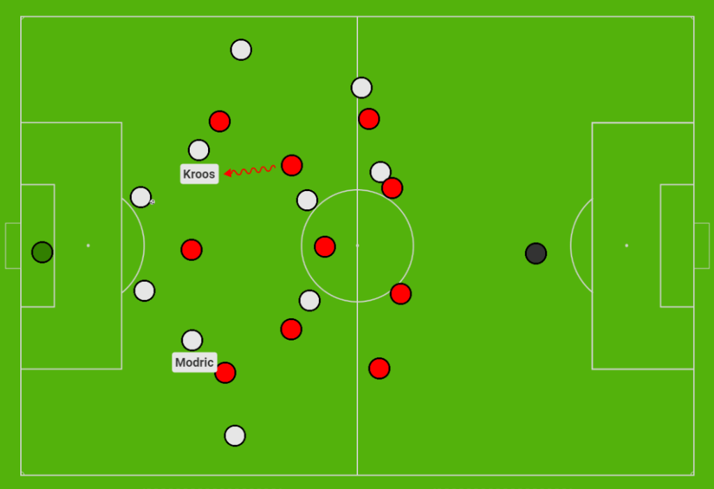 In this shape, Real Madrid worked the ball between their centre-backs to find avenues forward, where they could eventually use the carrying power of Benzema and Vinicius Junior, not to mention the exceptional weight of pass in Toni Kroos’ right foot, and the buzzing behaviour of Luka Modric. In other moments, such as David Alaba’s beautiful long spread for Benzema on the disallowed goal, the Frenchman looked for momentary gaps in between centre-back and full-back to receive over the top. Kroos completed 8 of his 10 long passes, whilst Modric managed 5/6, constantly offering a threat from deep for the likes of Vinicius and Benzema to go toe to toe with Liverpool’s back-line.