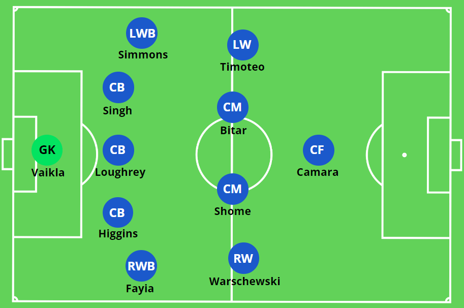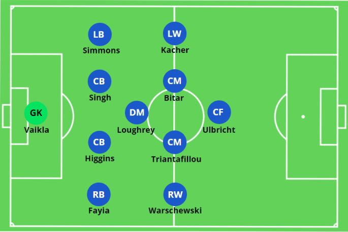 In the 4-1-4-1, Nyal Higgins may shift to right-back, as Simon Triantafillou finds his way into the midfield lineup with Bitar and Shome. The formation works fairly similarly to the natural inclinations of Cale Loughrey to step out of the back-line in a 5-4-1 anyway, with the full-backs still taking moments to join the attack and overlap their outside midfielders.