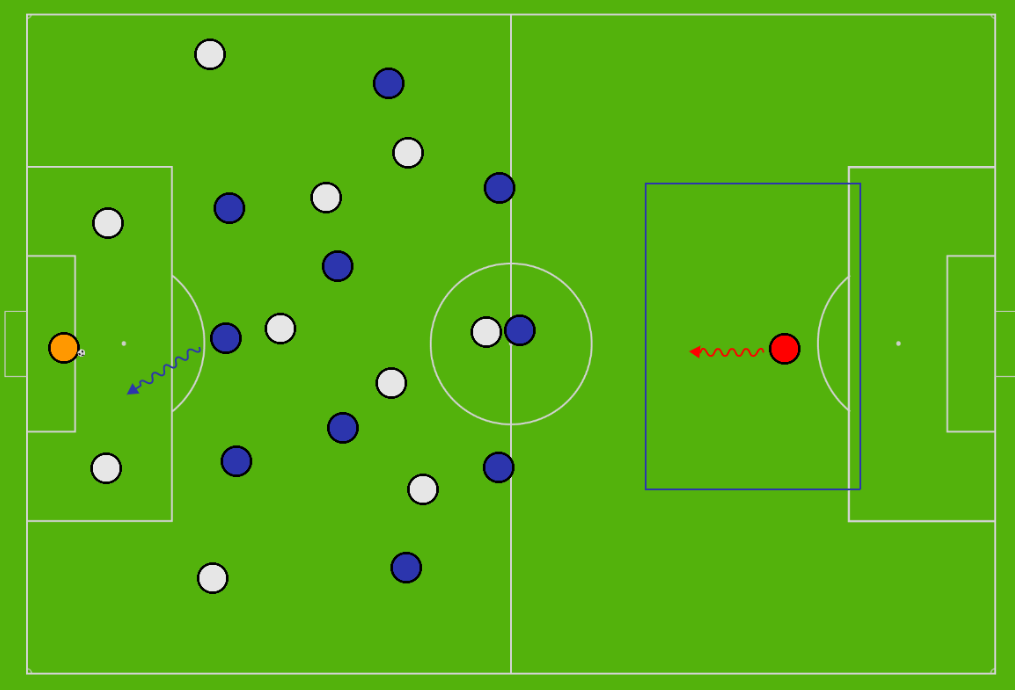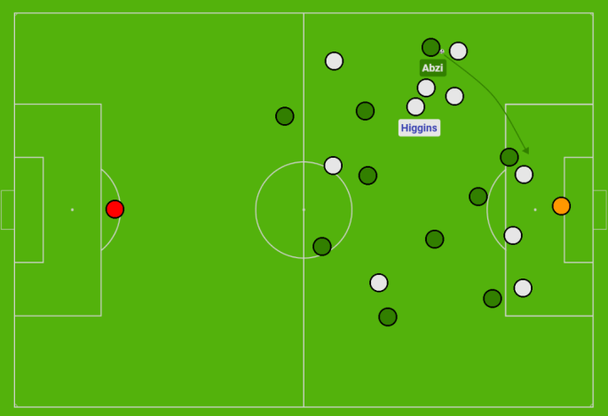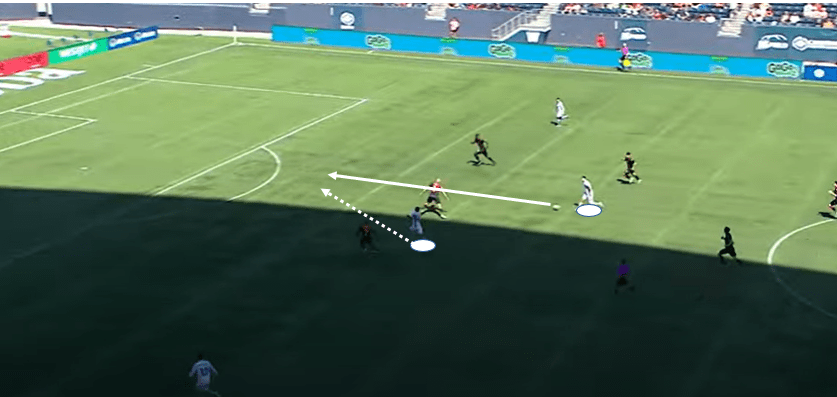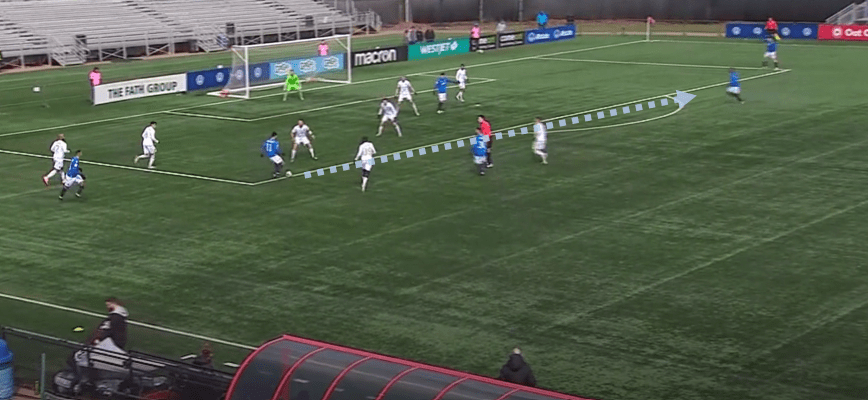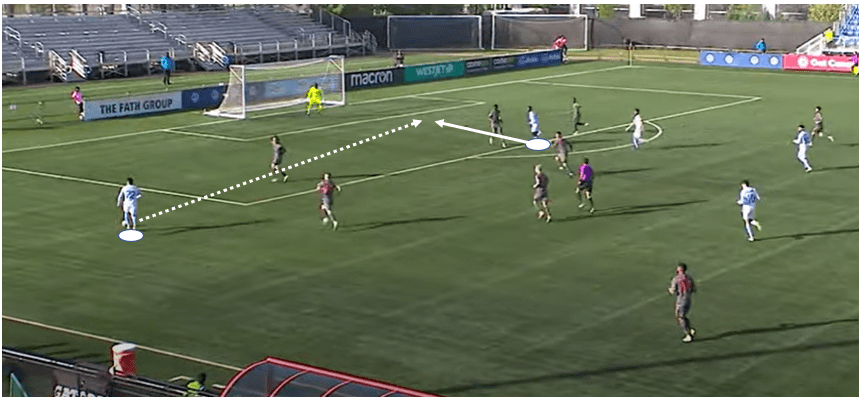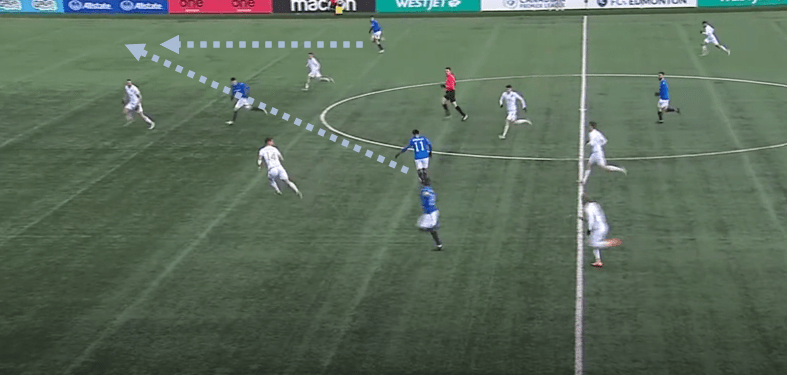 With just 37% possession this season (genuinely the lowest I’ve ever seen), Edmonton have in some ways modelled a fairly consistent playing philosophy, and in other ways, help to keep this section relatively short. They play direct football, particularly in targeting the wide areas, where the likes of Warschewski can be used for his aerial strength and presence, Azriel Gonzalez for his dynamic dribbling ability, or Marcus Simmons for his willingness to overlap and deliver crosses. In the few moments where they are able to generate sound possession and calm the play down, the Eddies will aim to create wide overloads, via their wing, wing-back/full-back and one central midfielder drifting toward the side of the ball. In doing so, space can often become available on the opposite side, should they find the right avenue to play into.