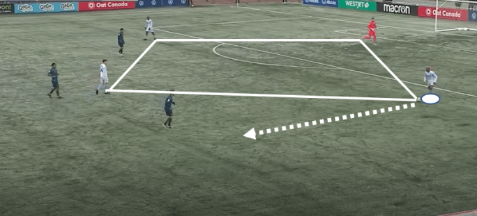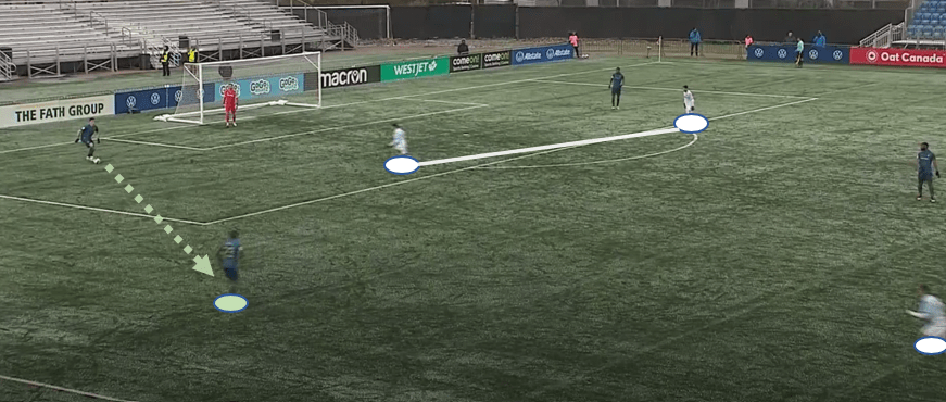 On goal kicks, the middle centre-back will shift to the top of the box and the top of the diamond as a result, as the centre-backs engage low in the goalkeeper’s box. Luke Singh is Vaikla’s most common target of the first pass when opting for the short play, and the TFC man remains a capable spreader of long diagonal passes. When given time and space, Singh will also look for moments to carry the ball forward and advance further up the pitch, where he likes to combine with Bitar and Simmons down the left.
