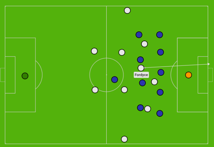 Understanding the strength of his teammates is not to keep the ball, Andreas Vaikla will however more often opt for the long-ball out from the back, aiming around the halfway-line for Tobias Warschewski’s right-sided position. Even if the Eddies play out from the back with the first pass, you can expect a long pass to feature soon afterward, from the likes of Singh or Bissainthe in particular. Despite their abysmal 37% possession this season, they’ve still completed the fifth most successful long passes per game this season (29.3 according to FotMob), illustrating in some ways their inability to progress through the thirds through ulterior means.
