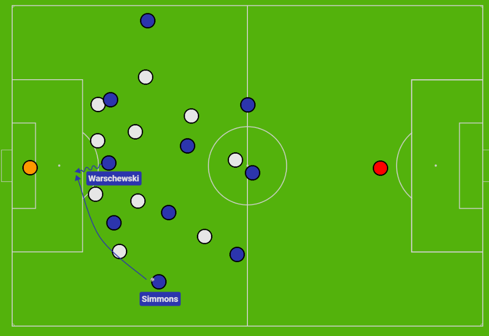 But even with a prioritization toward crossing, they don’t use Julian Ulbricht particularly well as a target man when he’s deployed, and so Mamadi Camara’s positional change has been a massively positive modification in matching Bitar’s strong running power. Bitar’s ability to drive through the middle, particularly in transition when afforded space to do so, takes the mantle as the team’s only mechanism for breaking lines and progressing beyond long passing and wing-play.