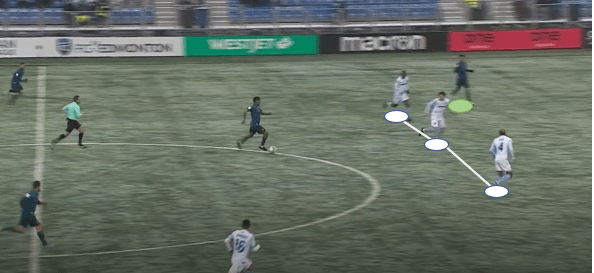 Keeping possession of the ball has never been Edmonton’s strong suit. Luke Singh remains their most capable progressor, and Bicou Bissainthe’s introduction into the team may be more about his ability to keep the team ticking in possession than anything to do with his defensive quality. Cale Loughrey was often more of a passenger in build-up phases, whereas Bissainthe will actively angle himself to receive and spread.