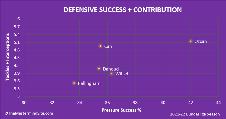 When looking at his defensive numbers, there are few others in the world of football that can compare to the 24-year-old’s impeccable awareness and quality. Özcan would be expected to play the role of a terrier in a Cologne set-up more focused on intense pressing, counter-pressing, and holding shape out of possession. His superior tackle + interception numbers won’t come as a surprise to anyone, even if they do boast well for his defensive IQ and positional intelligence. But his superior percentage points both on tackle and pressure success point toward a long-awaited upgrade in defending central pockets of space, and reducing their troubles in transition.