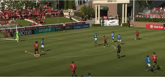 But we also cannot underestimate Pepple’s sound movement in the box. The Canadian forward always looks to get on the blindside of the defender, playing off the shoulder and creating distance away from his marker.