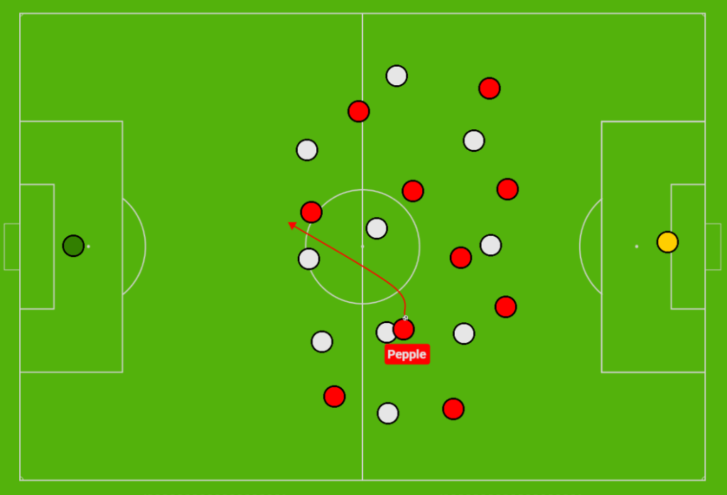 This is where the combination of his high footballing IQ and strapping strength to win 1v1 duels join up in a wonderful cocktail mix, and he pours those goals into the back of the net. Pepple’s goal conversion currently sits at 32% from his 2.7 shots per game – a remarkably high feat for any player, let alone a 19-year-old.