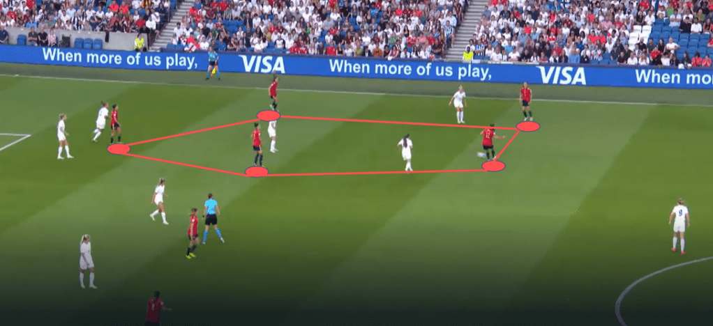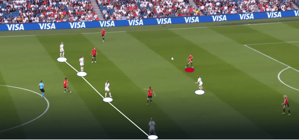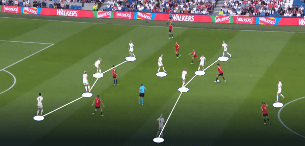 But more positively, with all four of the defenders so strong in the air, Spain never had a sight of goal from their crossing opportunities. Simultaneously, the narrow 4-1-4-1 also meant the Spaniards had little room to progress vertically up the pitch. If they won the ball back, they could then have Ellen White to play to as a target, who remained in close proximity to every low-block situation.