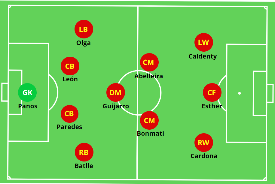 Their 4+2 esque build-up was met by clever movement and positional rotation ahead, followed by much in the way of positional play as they advanced into the attacking third. That came mostly down the left through Olga’s high and wide positioning, often as Mariona Caldenty drifted inside on the ball. However, their difference maker came on the other side of the attack, after Athenea del Castillo found herself introduced into the match in place of the lackluster Marta Cardona. Cardona had a few nice moments in those wide right overloads in the first half, but Athenea completely took the game to a new level for Spain, simply by going at Rachel Daly.