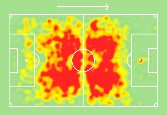 The red spots cover the entire central and half-spaces of the pitch, roaming about the pitch to always come to the side of the ball, receive, and keep the game ticking along. They may make the odd touch in their own penalty area, but their hard work stops just inside the final third. They may however have responsibilities of taking set-pieces (such as Jorginho’s precision penalty kicks or Kyle Bekker’s whipped free kicks), due to the confidence and class they exude.
