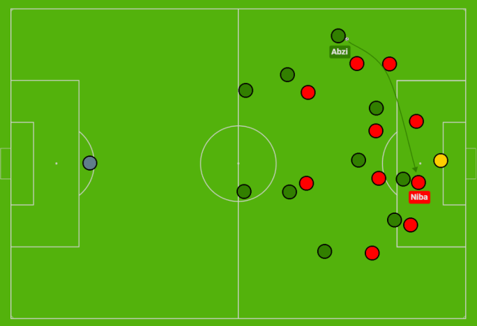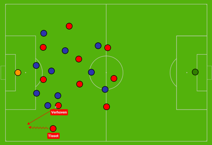 Again, the endeavour to hurt Ottleti on the break is complicated by the fact that the left-central-midfielder remains ready to cover in behind for Tissot. That player is then backed up by the most robust and proactive defender on the day, whether that be Niba, Beckie or even Sissoko himself as the left-centre-back. Tissot himself is the team’s top interceptor, whilst Acosta, Espejo, Beckie and Sissoko are all prepared to pick up a booking when necessary, even if unintentionally.