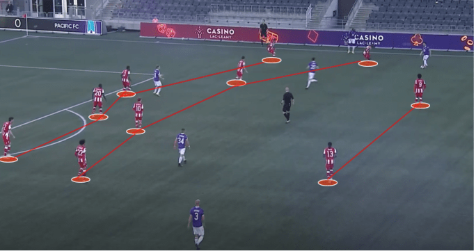 This can only be described as incredible fluidity, but the fluidity also happens to be incredibly rigid. 10/10 times, it’s the left-back that overlaps into the attack to create that wide-left overload, rather than the right-back, who always remains part of a firm back-three. The player operating in the left-wing role out of possession then rarely ventures any further than central channels when the possession changes fortunes. This rigidness in organization helps Ottleti to achieve a sense of consistency in their principles of play, where players are better able to understand their role on the pitch and enact the manager’s plans. We will delve deeper into the specific intricacies of both shapes as we move along, but this fluctuation between shapes must be noted as a preeminent factor behind Atleti’s brilliance in 2022 in the Canadian Premier League.