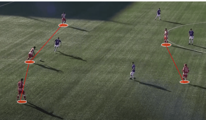 So what about pressing? Ottleti have the lowest line of engagement, but that doesn’t mean they never press from the front. In fact, they do so with an intriguing look. Bassett pushes up all the way to the front in a 4-3-1-2-esque shape, limiting central penetration all the more.