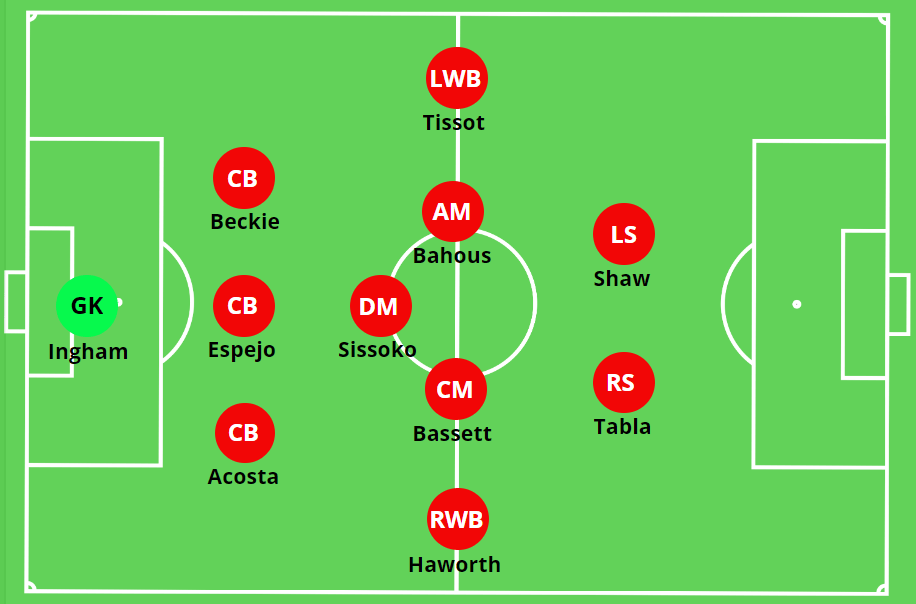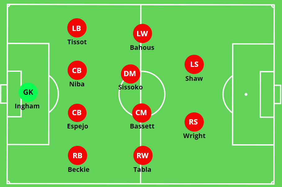 Occasionally, Bassett and Sissoko will have a third member of their midfield join their ranks, beyond just those in-possession 3-5-2 moments. In quite a few matches over the past few months, their out-of-possession shape has actually transformed into 4-1-4-1 instead, which is perhaps one more reason for Sissoko’s inclusion as a ‘Midfield Destroyer’. This has seen Zakaria Bahous take on the role of a ‘Midfield Maestro’, looking to get on the ball and dribble his way through tight spaces. He’s been equally capable of playing that left-sided half-space role to a slightly more influential effect than Zach Verhoven before him, staying in that same slot when possession changes hands. That shape would then see Malcolm Shaw become the left-winger out of possession, as Brian Wright holds rank as the lone striker. But normally, those two hold strong as a pair up top, chasing down long balls in the channels, and trying to get on the end of crosses into the box.