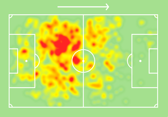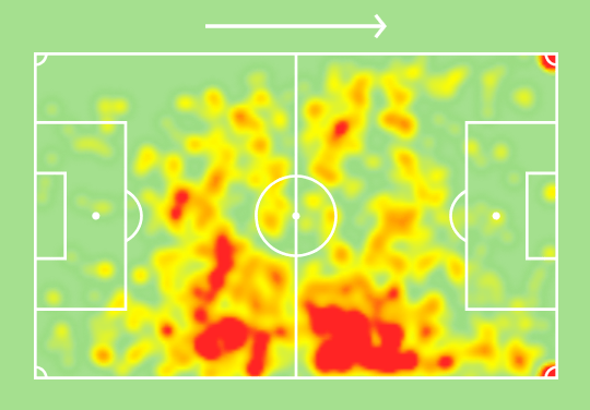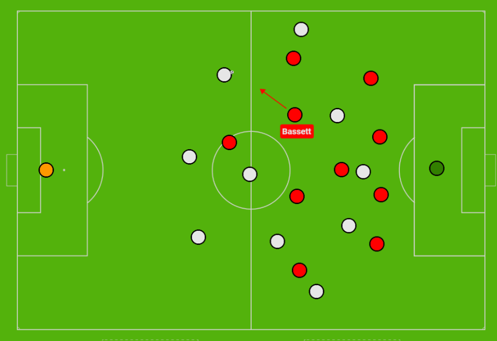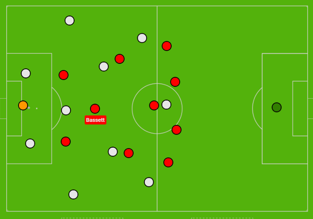 Creating nearly 2 chances per game, you can see the influence of Bassett in his heatmap alone, and just how often he looks to receive the ball down the right half-spaces to right-wing. In doing so, he allows for greater fluidity of movement for someone like Tabla to come toward the ball and envelop deeper pockets of space. He can then push that right-wing-back higher, whether that be Tabla or Haworth, simultaneously pushing the opposition’s defensive line back. Being an incredibly two-footed individual, Bassett then has the depth of quality to quickly wiggle his way out of trouble when pressed, ensuring Ottleti can keep hold of the ball for longer spells of time without solely relying on long passes.