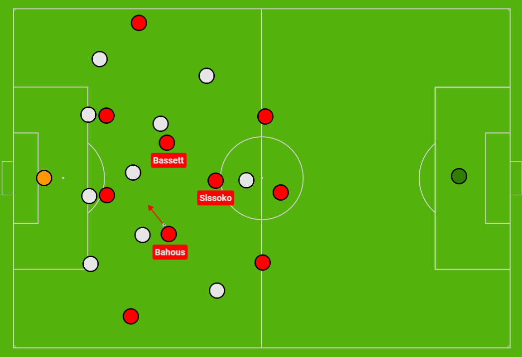 If the press is broken, Bassett evidently has more work to do in getting back into position, so that is where the wingers must narrow alongside Sissoko. In the team’s 4-1-4-1, it’s again the central midfielders pushing the envelope, actively stepping out to pressure opposition centre-backs one at a time. They’re afforded the ability to do so, knowing the resolute Sissoko screens and holds rank in behind.