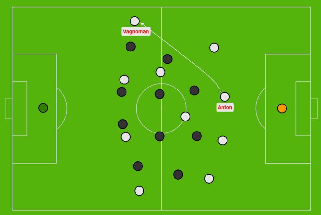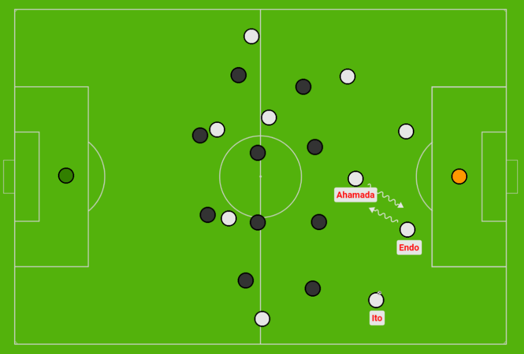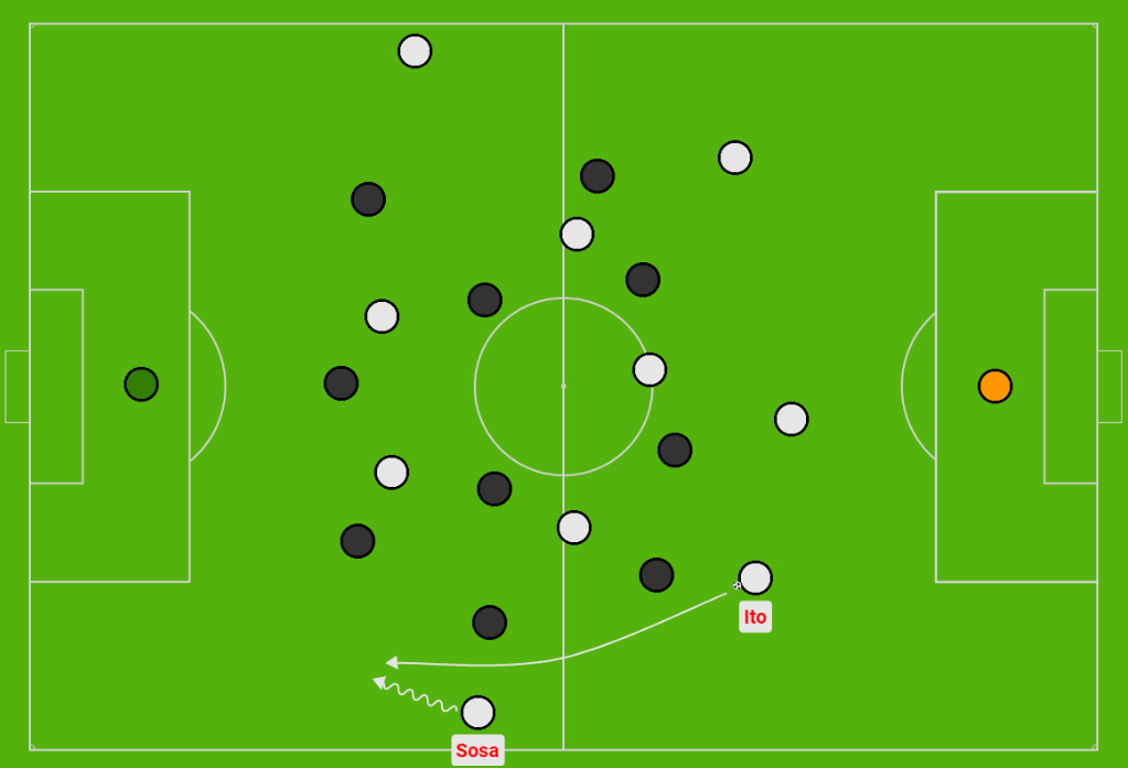 Embed from Getty ImagesIn progression phases where their circulation remains patient and calm, Ito and Anton will often be the ones most involved. They pass the ball around in looking for angles to deploy a sense of one-touchness in the wide areas, before switching play and allowing someone like Ahamada to carry the ball up the pitch. Those one-touch combinations may involve the wing-backs, but more likely the central midfielders as the near-sided player shifts to the side of the ball. Their progression shape therefore becomes more 3+3, resembling their initial starting positions; as the wing-backs push high and wide into the attack.