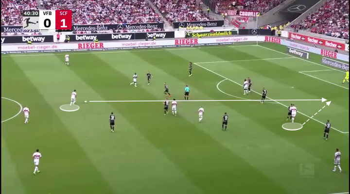 In stretching the field, they then have more avenues for progressive carrying through the middle, and natural outlets for someone like Ito or Mavropanos to drop a long diagonal on a dime. While Stuttgart had issues in generating quality chances of note against Freiburg in their third match, their build-up always remained impeccably concocted.