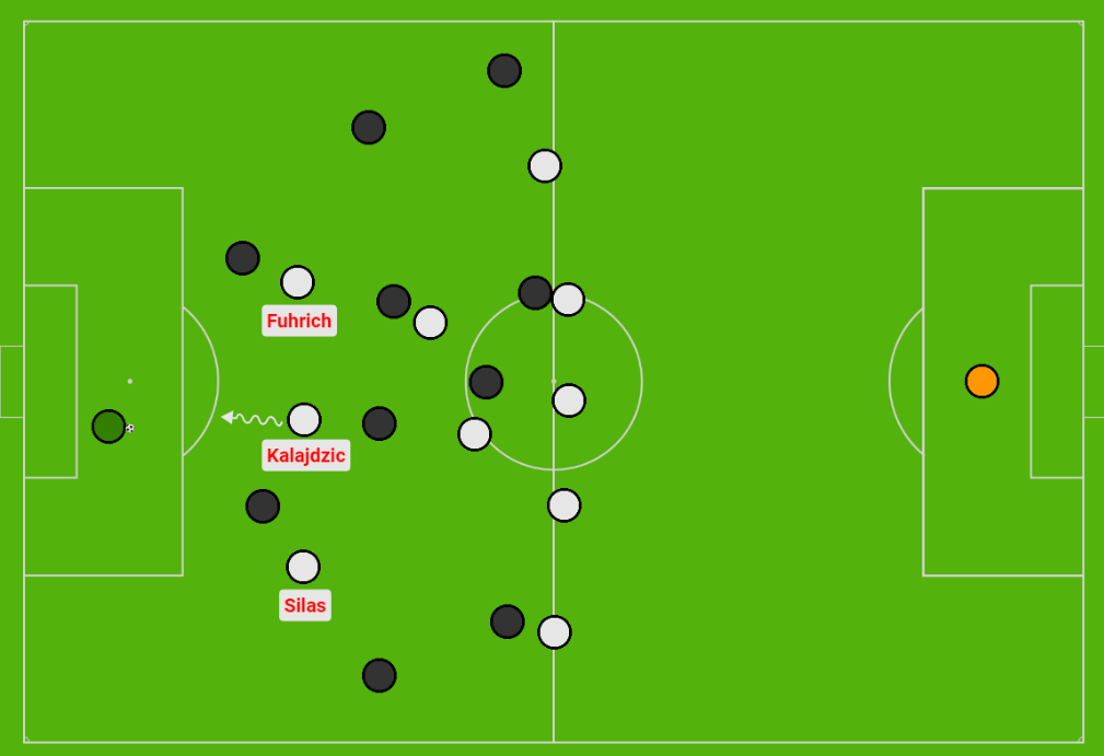 The most common rotation would be between Ahamada and Endo, with both seamlessly dropping into the back-line to aid circulation. But Ito will also look for moments to drift in-field, as Anton swaps between anchoring low and going on a journey to receive a forward pass. If the opposition’s press becomes too much to handle, Führich can then add to the equation, or Die Schwaben can go long, as they are naturally inclined to do anyway. Ito, Mavropanos and Anton are all solid long passers of the ball, and frequently search for either the wide areas or Saša Kalajdžić through the middle. They can then use Kalajdžić’s aerial presence to escape pressure and advance the team up the pitch, as the second striker (Tomas or Silas) prepares to roam in behind. Kalajdžić is excellent in drawing defenders away in all phases of the game, and that continuously opens up the opportunity for his partners to wreak havoc and fire the ball toward goal.