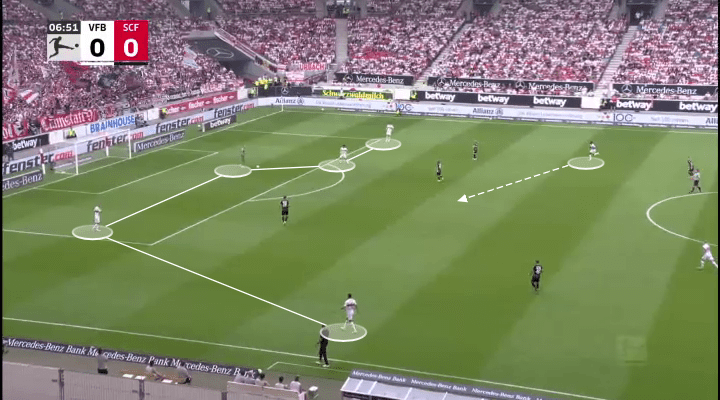 Against Freiburg, Führich played firmly alongside the front line in a 5-2-3 high-block. Kalajdžić then had the task of screening the opposition’s defensive midfielder, but he struggled to find the balance between shaping up and holding his defensive stance, and becoming bored of that and nonsensically pressuring the goalkeeper when not required, thus vacating the space for Freiburg’s Nicolas Höfler to receive. Führich stuck to his task well in shuffling with the play, but his advanced role again created some holes in the Stuttgart machine, particularly in creating too much for Endo and Ahamada to handle on their own.
