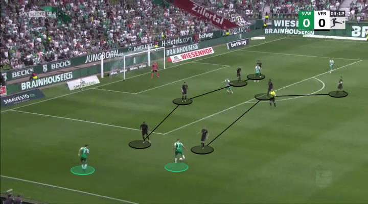 Meanwhile, the 4-4-2 may also come to life as the near-sided wing-back holds a higher position. This caused several issues in the opening moments of their match against Werder Bremen, with Die Werderaner using Anthony Jung to stretch the width of the field and cause chaos down Stuttgart’s right. To an extent, the same could be said of using Führich in an advanced role against Freiburg, where the half-spaces were then more easily exposed in the team’s low-block. On both occasions, switches of play became particularly deadly, and Anton could have taken more control and command of the situation in shaping the team and clearing the ball out of danger when required.