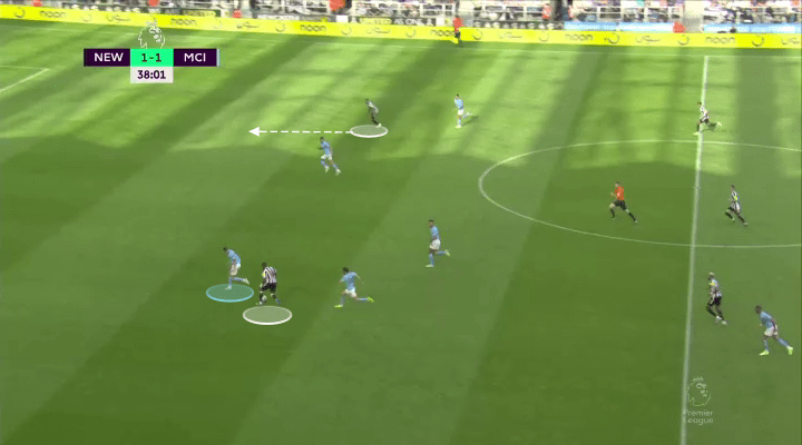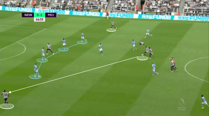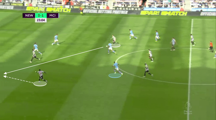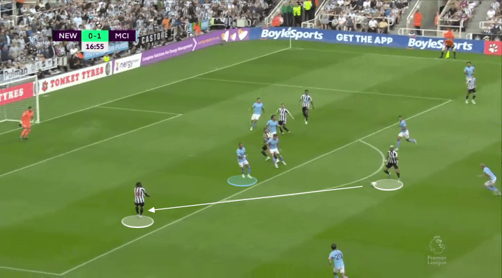 When you have the quality of a player like Bruno Guimarães to play a diagonal over a reasonable distance, it then makes it much easier for a dazzling dancer like Saint-Maximin to shine. Checkmark number one ✅. ASM is then able to find himself in acres of space to work his twinkle toe magic and cast a spell on City’s defense as they collapse toward the goal. This was the first warning sign, but City didn’t correct their approach. Here we go again like we’re Fabrizio Romano.