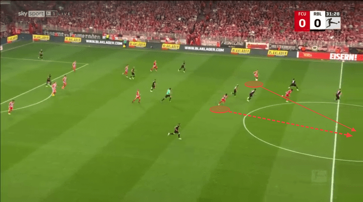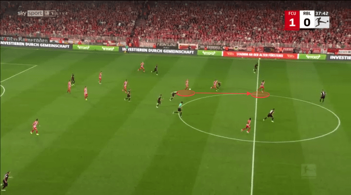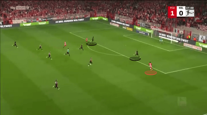 For the first goal of the game, Union win the ball in their own penalty area, and immediately play forward into their strikers to hold the ball up and bounce to a nearby central midfielder. They then spin around to create space behind Leipzig’s high-line.