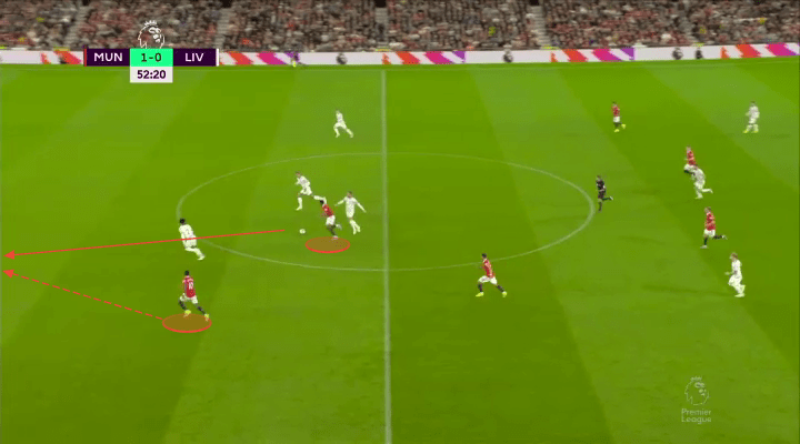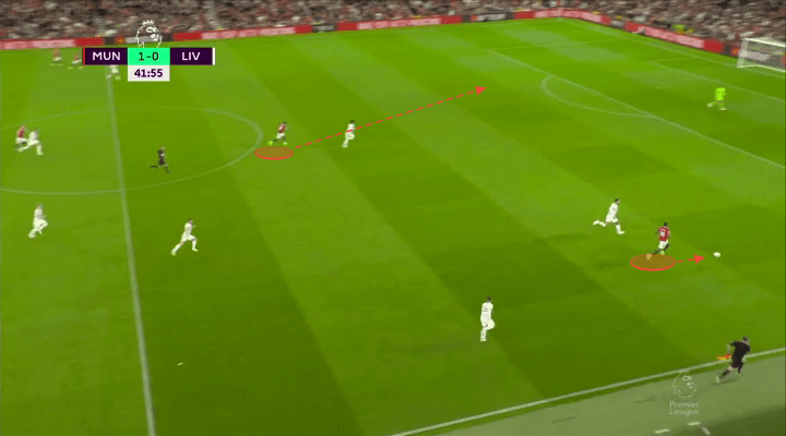 Here the 24-year-old can be seen picking up a position to the left of Liverpool’s Joe Gomez, on his blindside. Liverpool meanwhile over-compacted themselves in the immediate aftermath of losing the ball to Martial, and the Frenchman took that split second advantage in threading the ball through to the striker.