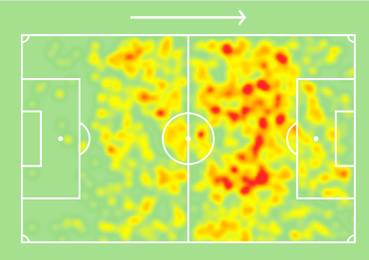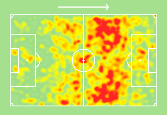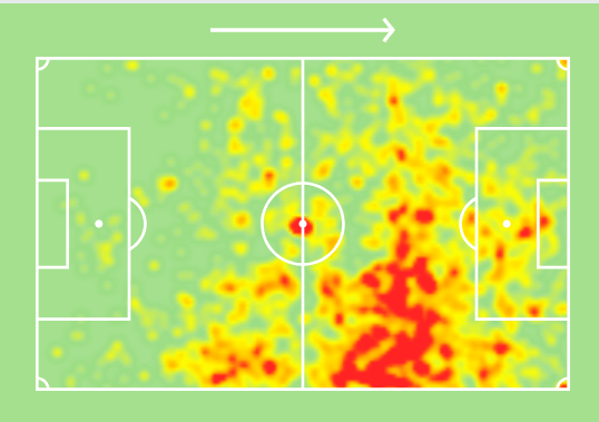 The point is that they play in a creative, linking role in that ‘number 10’ slot, with the end goal of being both a creative and scoring force. So rather than the heatmap of Debinha, which is arched to the left, and the heatmap of Muller, which presents right-sided dominance; we want to see a heatmap that nicely covers both sides. The ‘Creative Ten’ should be an active mover and shaker that roams up and down, side to side, and covers a range of areas from ‘Zone 14’ in the centre to the half-spaces. Here’s an example of Marco Reus’s heatmap to illustrate the idea.
