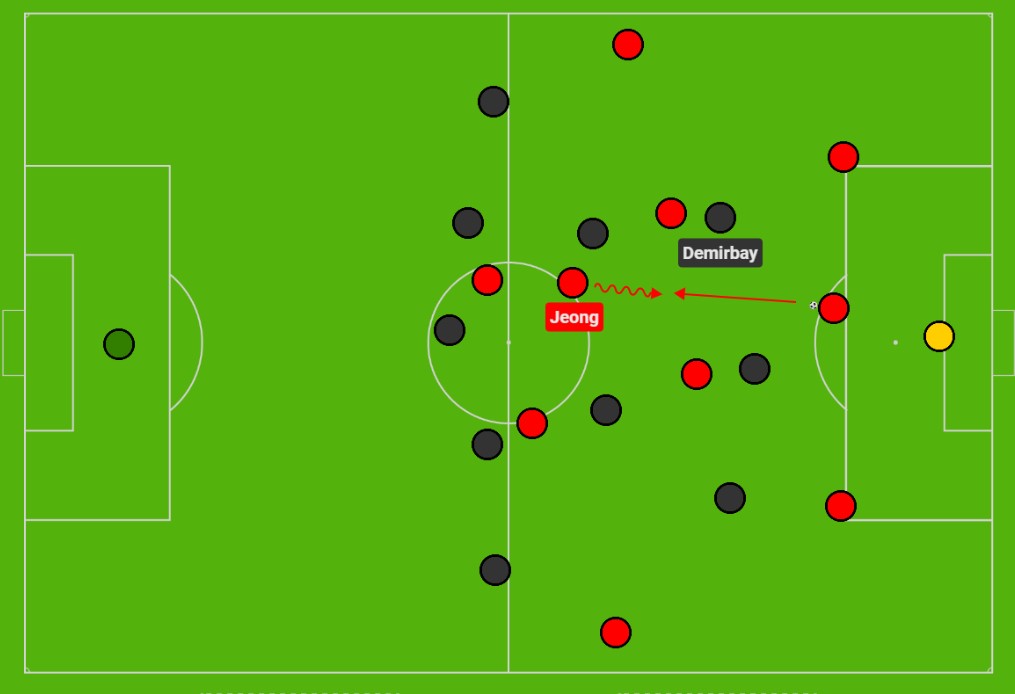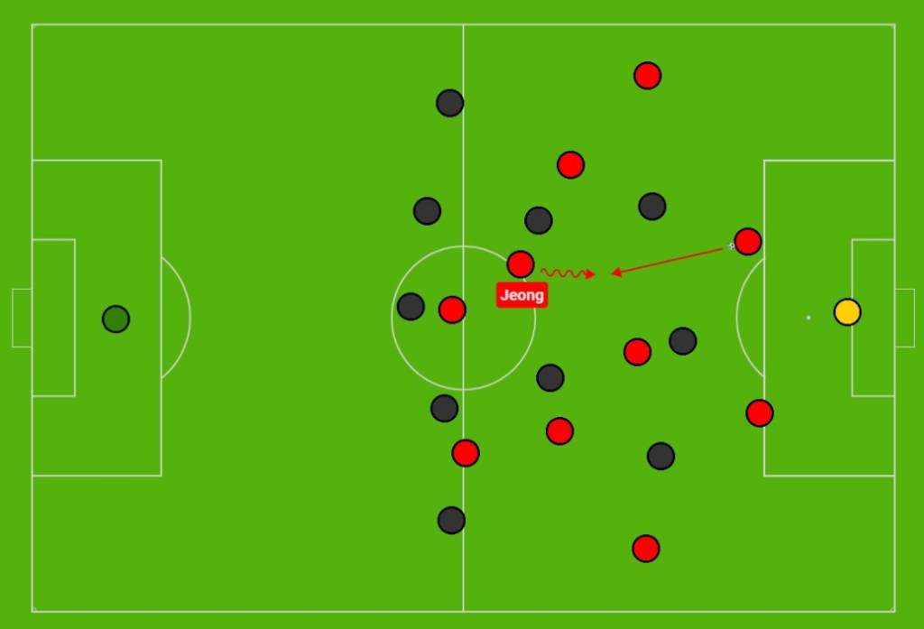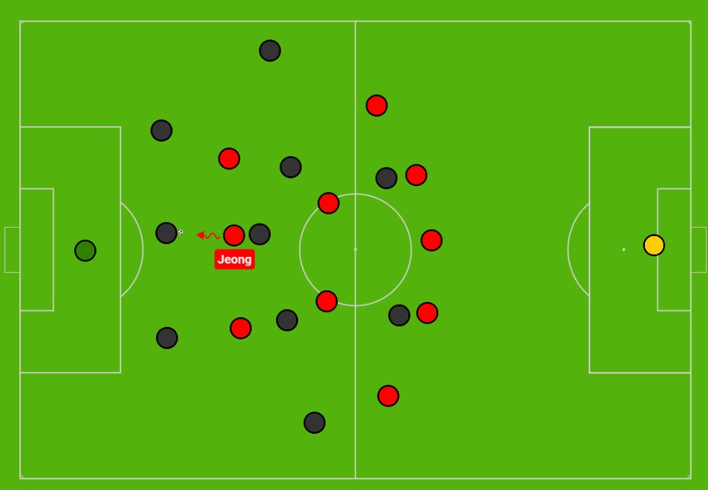 As Grifo’s positioning became one of relative fluidity, Woo Yeong-Jeong could then take more opportunities to float in between the lines himself, which ended up playing an essential role in Freiburg’s second goal of the match. Jeong’s pressure completely confuzzled Tapsoba into terror, before playing a snail of a pass toward his goalkeeper. Jeong picked it up, played it across to Gregoritsch and the centre-forward found himself in the right place, right time, once more.