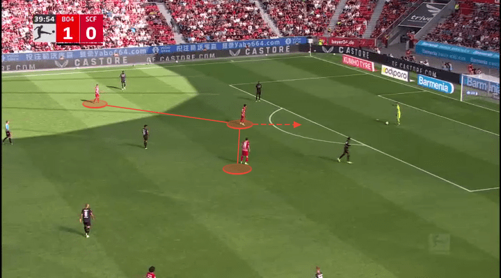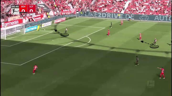 The same however could be said of the other eleven, even if less tactically complex. Freiburg’s front-three also matched up nicely against Bayer’s back-three, with Seoane’s side struggling to find adequate avenues forward all afternoon. Woo Yeong-Jeong perfectly understood when to drop deeper in his role to coincide with Leverkusen’s movement up the pitch, and otherwise led the press with the right vigour and intensity required.